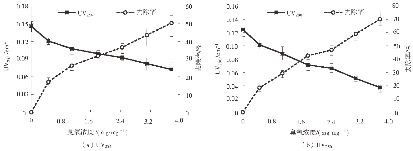 圖6 不同臭氧投加量下UV254、UV280的濃度及去除率