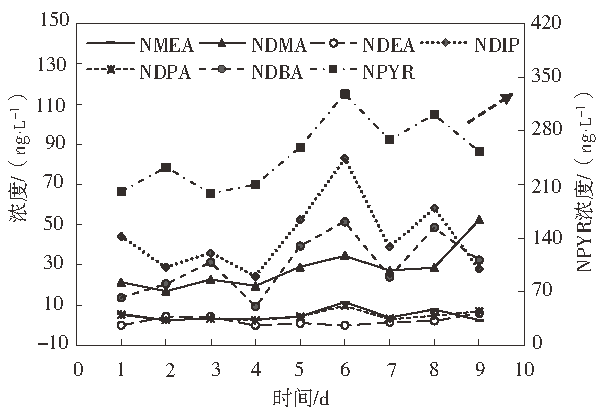 1)二級出水中檢測出7種亞硝胺類物質(NPYR、NDIP、NDBA、NDMA、NDEA、NDPA和NMEA)的濃度由大到小依次為NPYR、NDIP、NDBA、NDMA、NMEA、NDPA和NDEA,均值分別為250、45.96、31.17、28、4.92、4.71和2.15 ng·L−1。